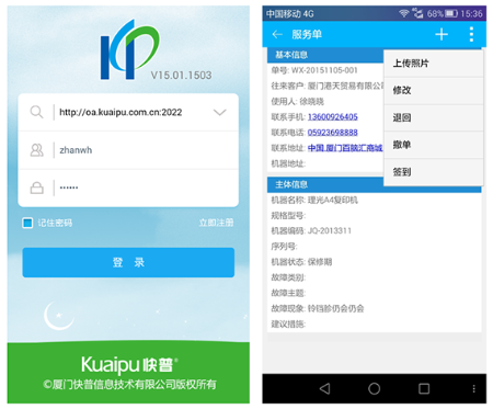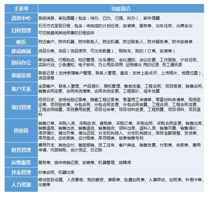 移動(dòng)服務(wù)接單、機(jī)器二維碼掃描、手機(jī)拍照定位、機(jī)器新增查詢(xún)、耗材查詢(xún)、客戶(hù)新增查詢(xún)、實(shí)時(shí)庫(kù)存查詢(xún)、知識(shí)庫(kù)查詢(xún)、應(yīng)收款及對(duì)帳、移動(dòng)辦公及審批等;