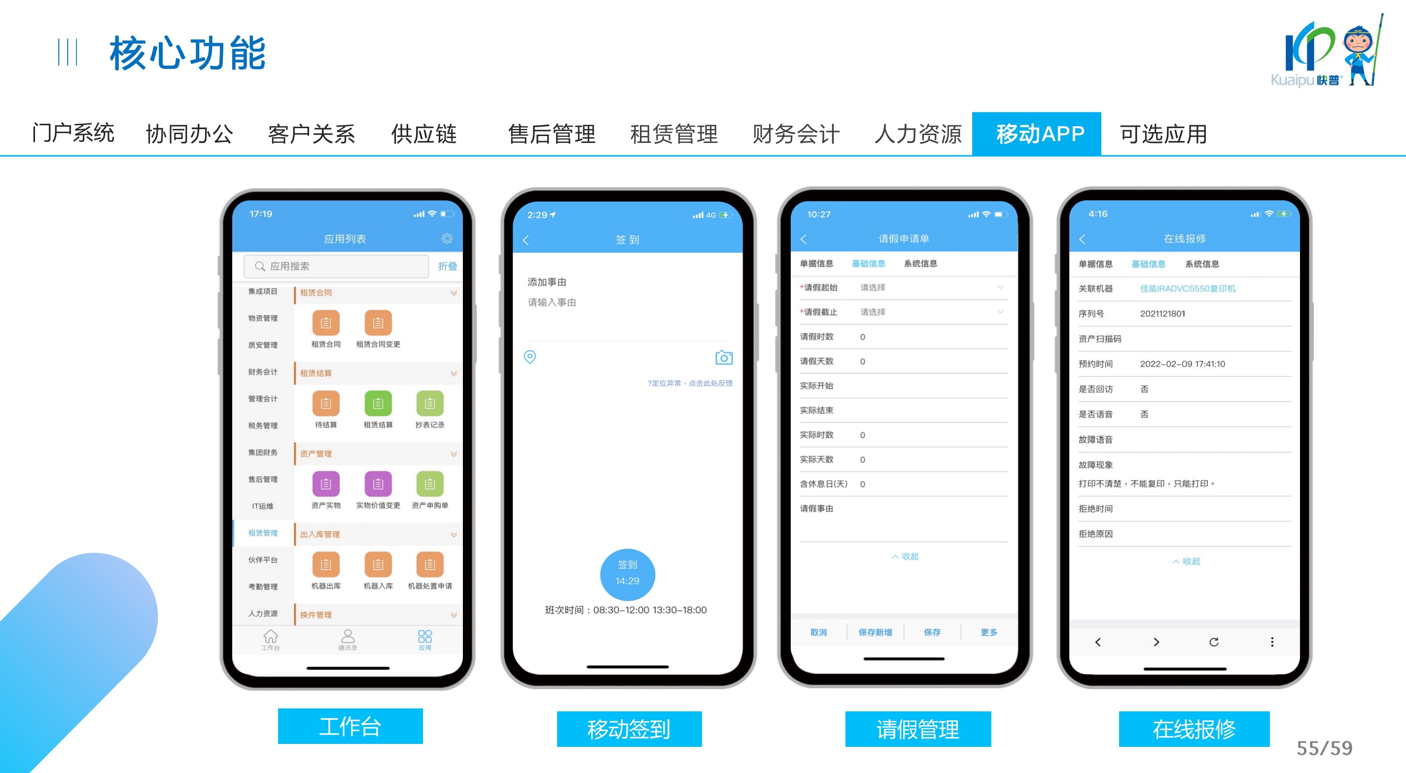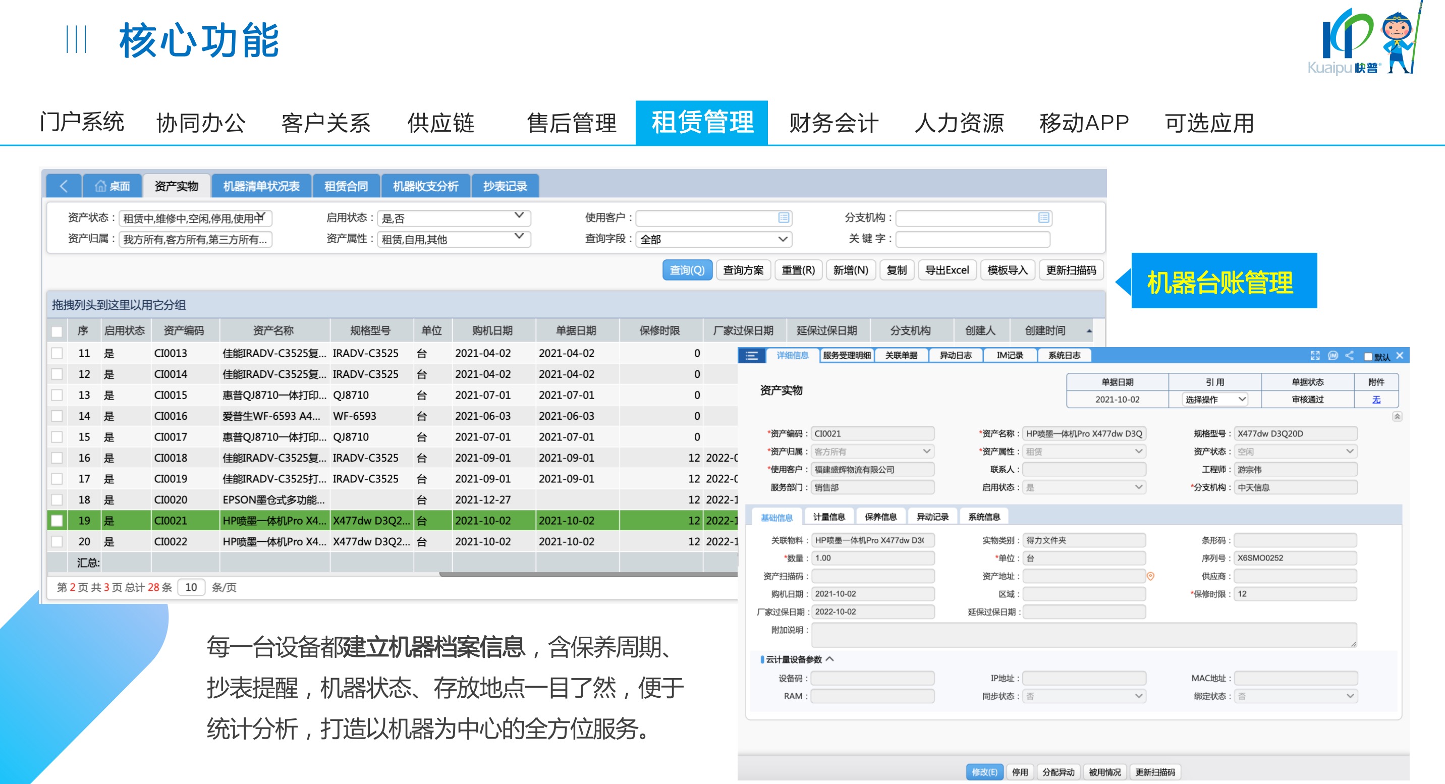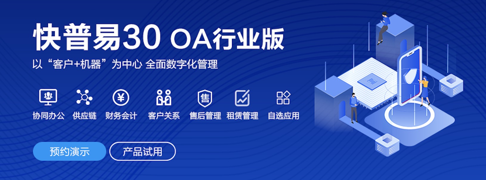 快普易30基于快普近20年在全國上萬家OA企業(yè)的實(shí)施與服務(wù)經(jīng)驗(yàn),融合了行業(yè)成功的管理智慧,以“客戶+機(jī)器”為中心提供數(shù)字化轉(zhuǎn)型解決方案,全面解決銷售、服務(wù)、租賃等多種業(yè)務(wù)模式的管理需求,以及企業(yè)經(jīng)營核算分析。
