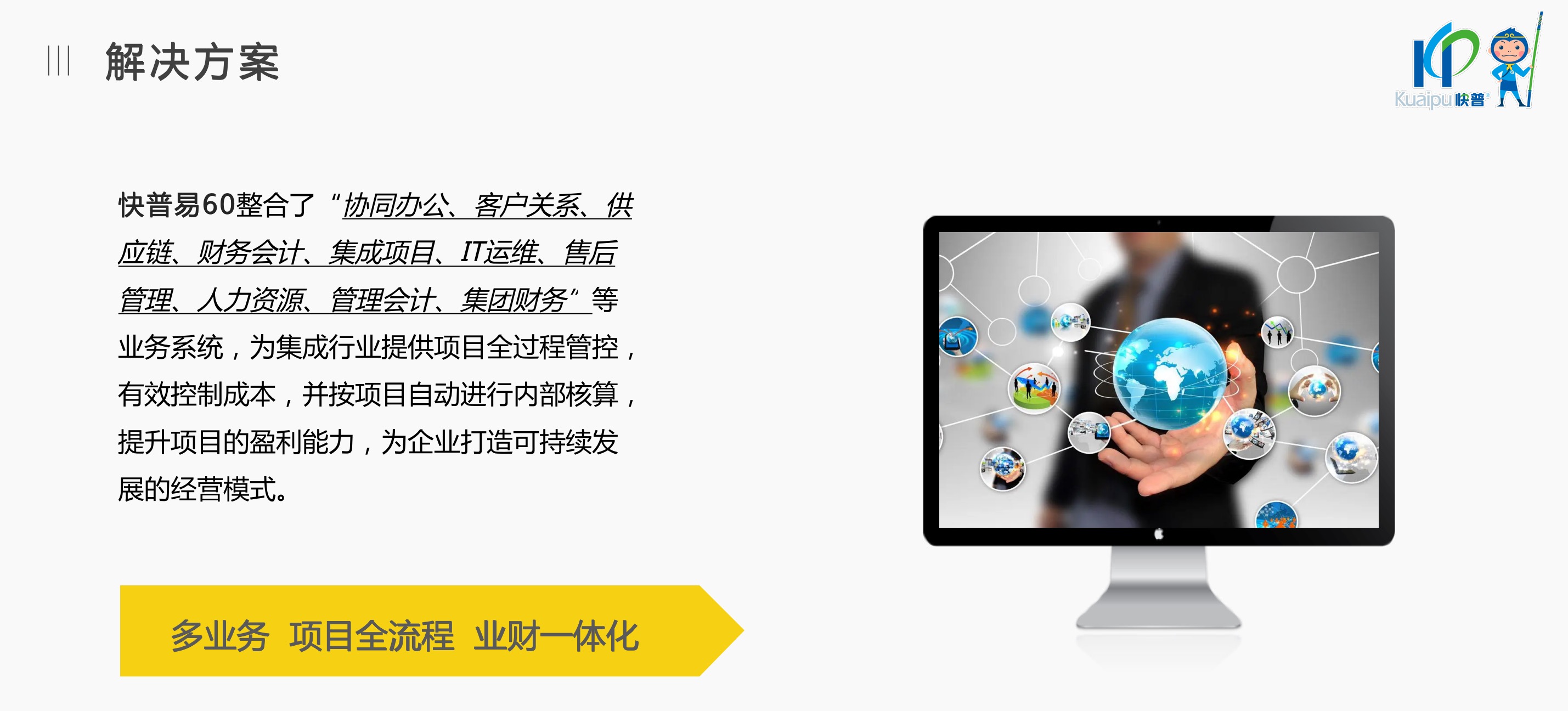 快普易60以客戶為目標(biāo)、以項(xiàng)目為核心,為集成行業(yè)提供數(shù)字化管理解決方案,為組織和業(yè)務(wù)提效,實(shí)現(xiàn)項(xiàng)目全過程管控,有效控制成本,并按項(xiàng)目自動(dòng)進(jìn)行內(nèi)部核算,提升項(xiàng)目的盈利能力,為企業(yè)打造可持續(xù)發(fā)展的經(jīng)營(yíng)模式。