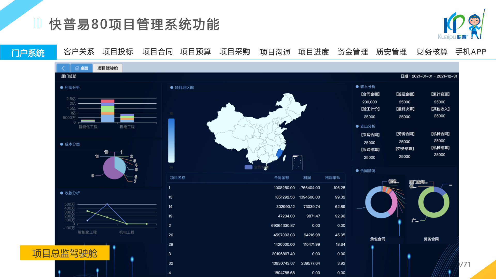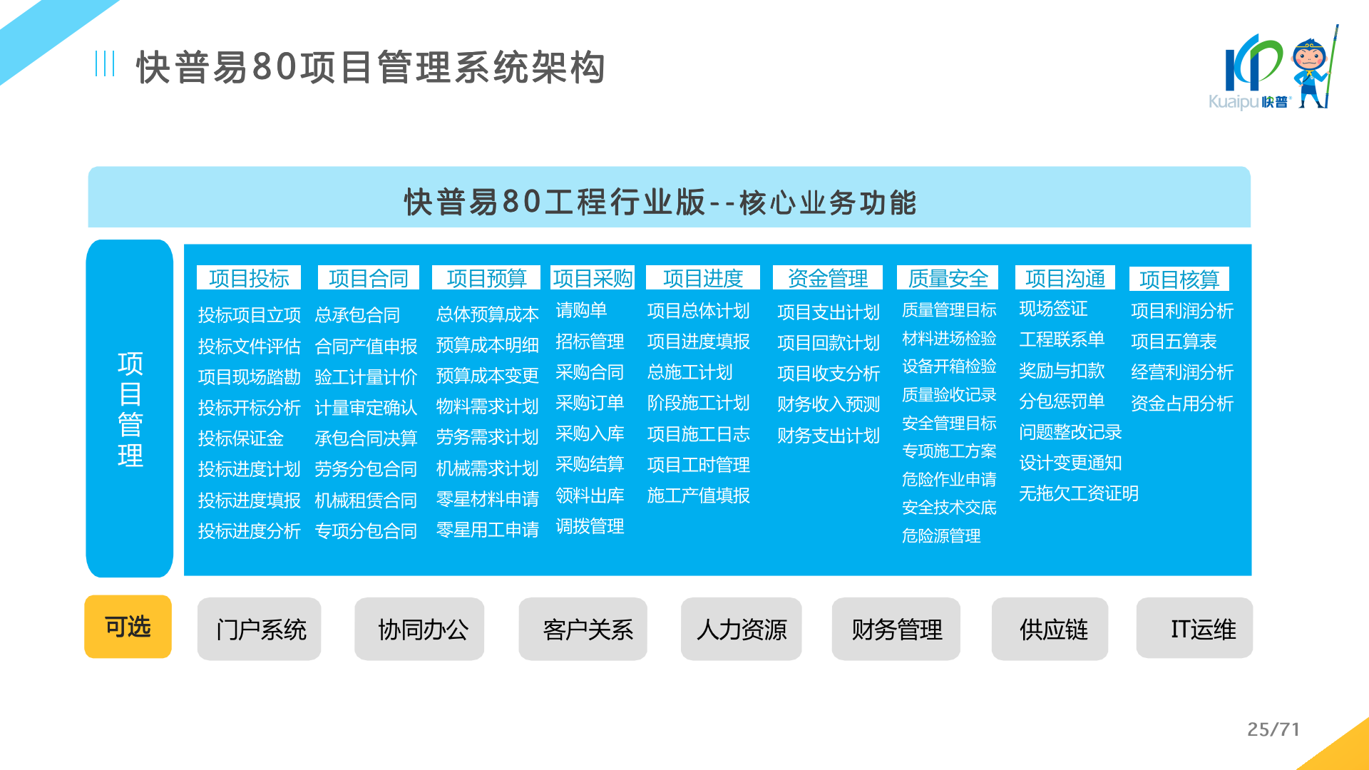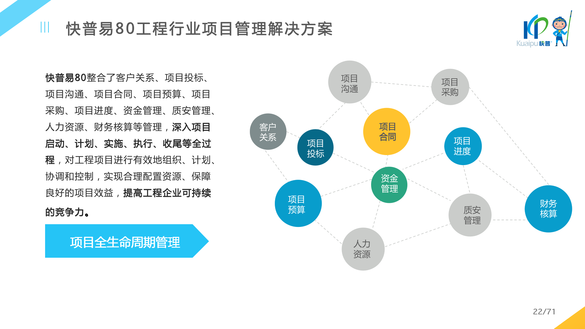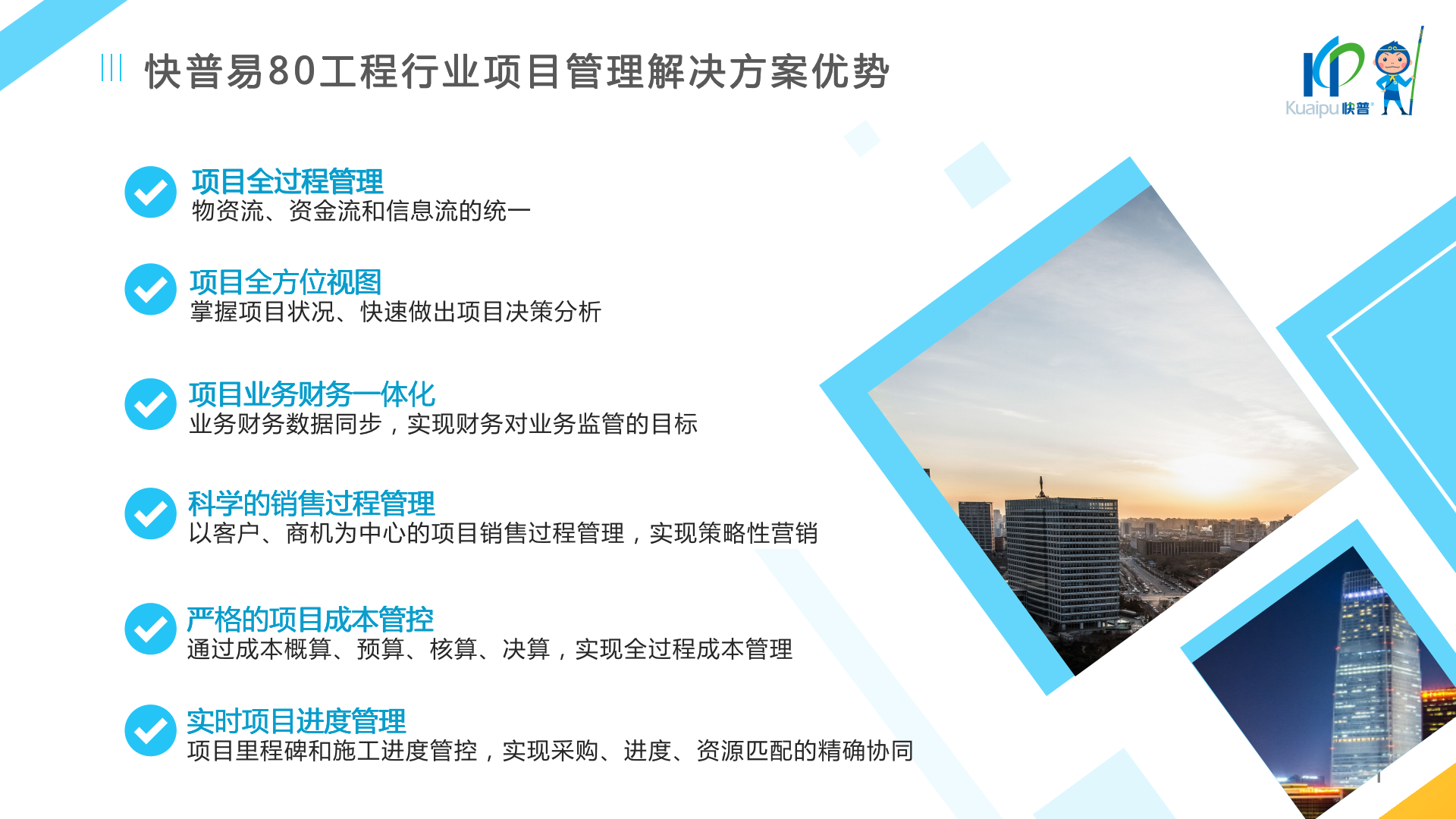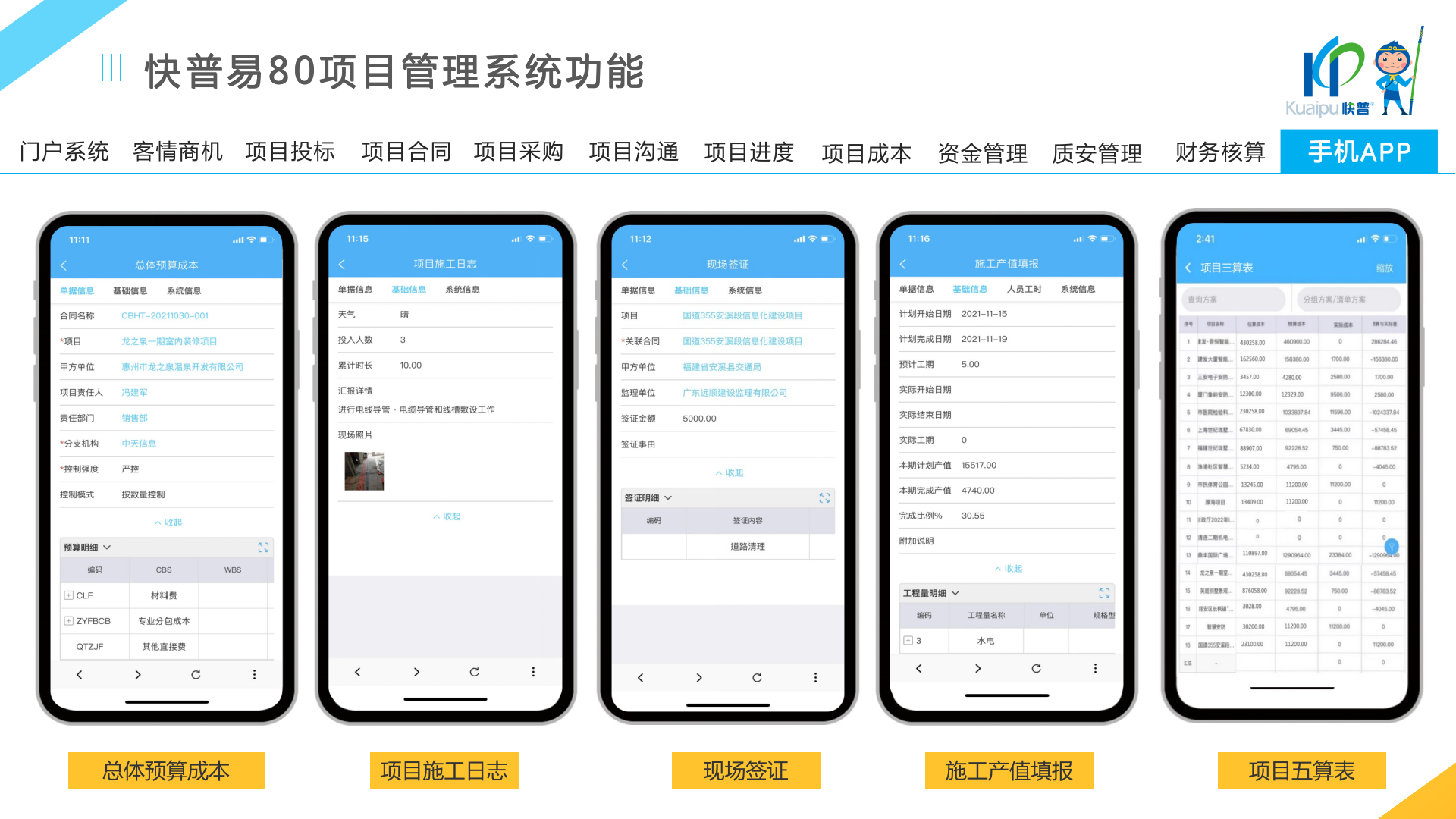 快普易80以項(xiàng)目管理為核心,通過(guò)“四控、四管、一協(xié)調(diào)”方式,對(duì)項(xiàng)目進(jìn)度、成本、資金、質(zhì)量安全進(jìn)行全面控制,實(shí)現(xiàn)投標(biāo)管理、合同管理、物資管理、預(yù)算管理等項(xiàng)目全生命周期項(xiàng)目的數(shù)字化管理,實(shí)現(xiàn)資源合理配置、保障良好的項(xiàng)目效益。