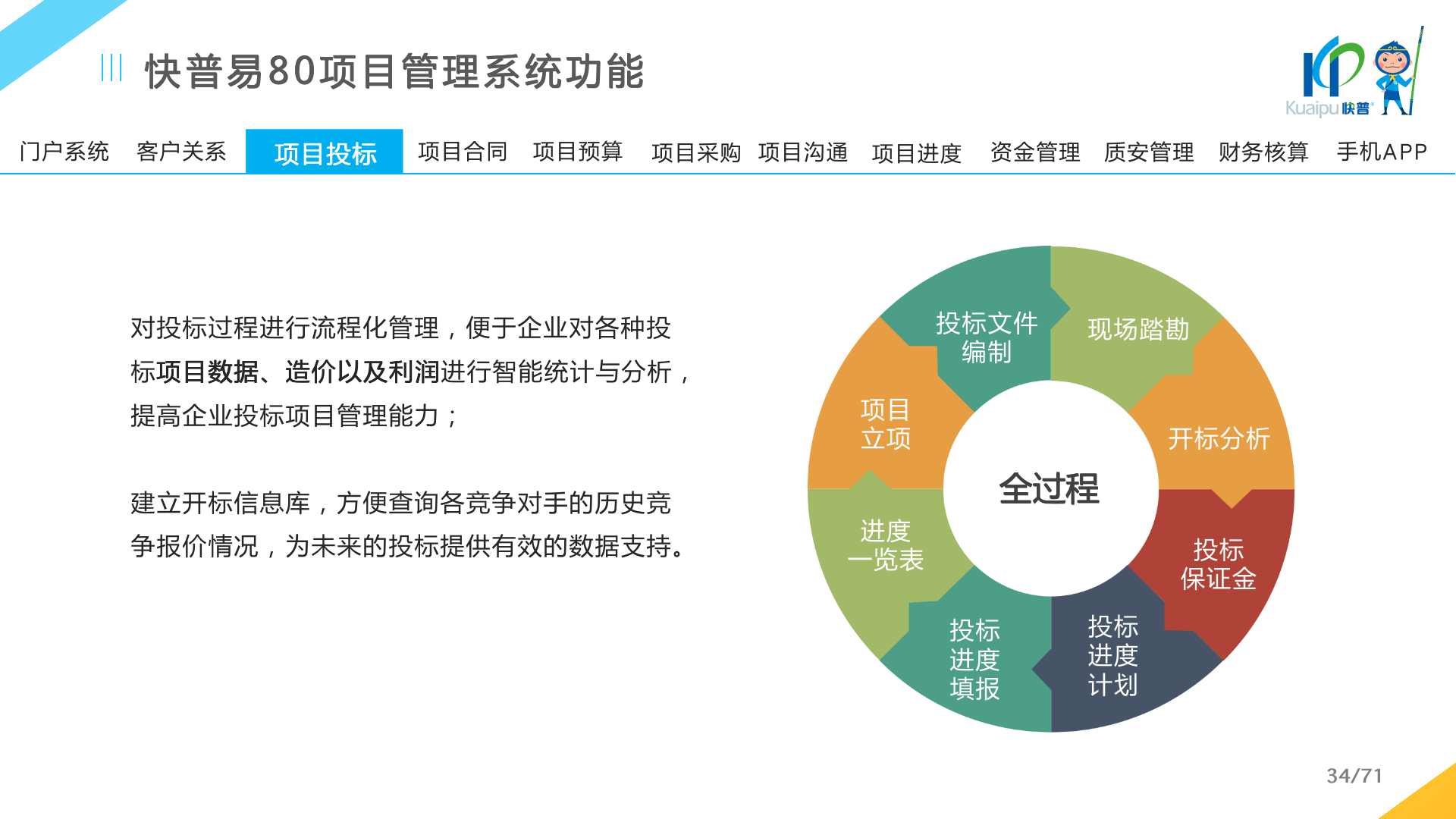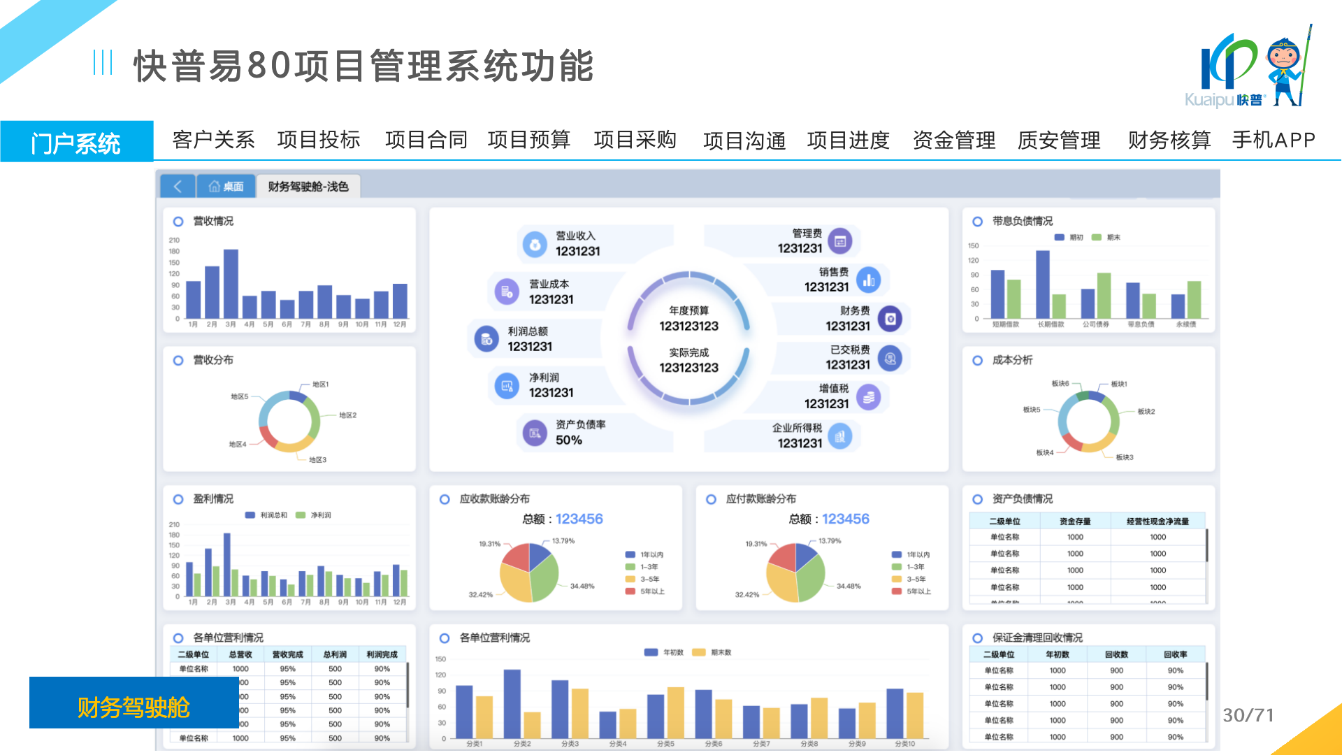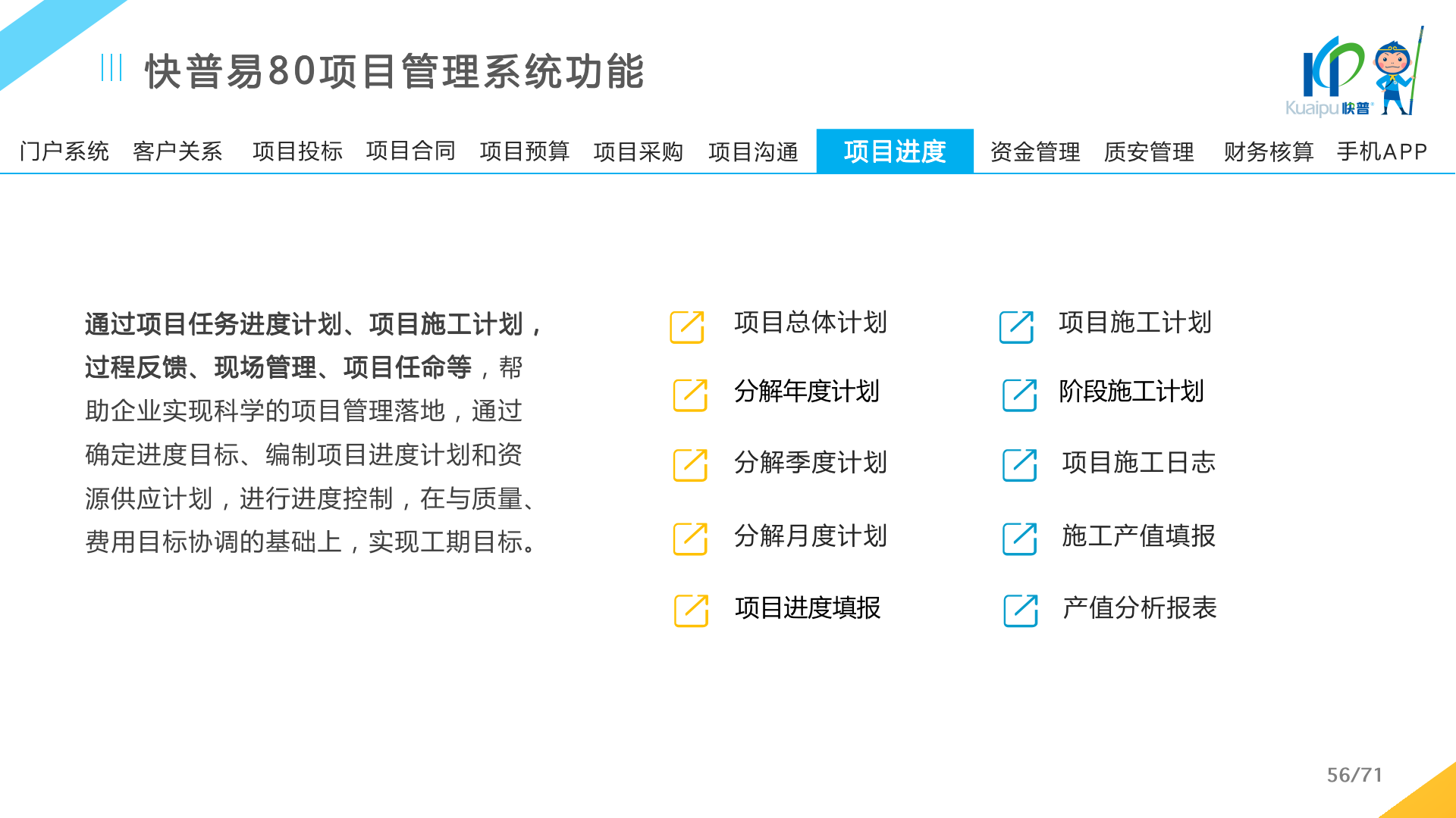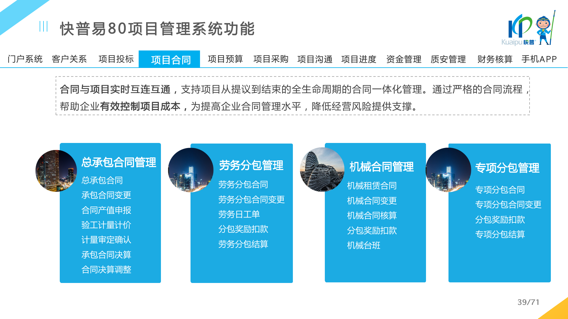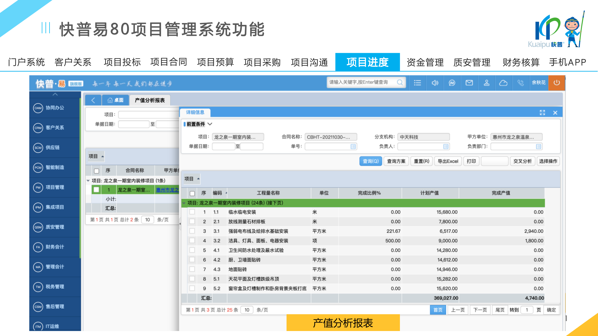 快普易80以項(xiàng)目管理為核心,通過(guò)“四控、四管、一協(xié)調(diào)”方式,對(duì)項(xiàng)目進(jìn)度、成本、資金、質(zhì)量安全進(jìn)行全面控制,實(shí)現(xiàn)投標(biāo)管理、合同管理、物資管理、預(yù)算管理等項(xiàng)目全生命周期項(xiàng)目的數(shù)字化管理,實(shí)現(xiàn)資源合理配置、保障良好的項(xiàng)目效益。