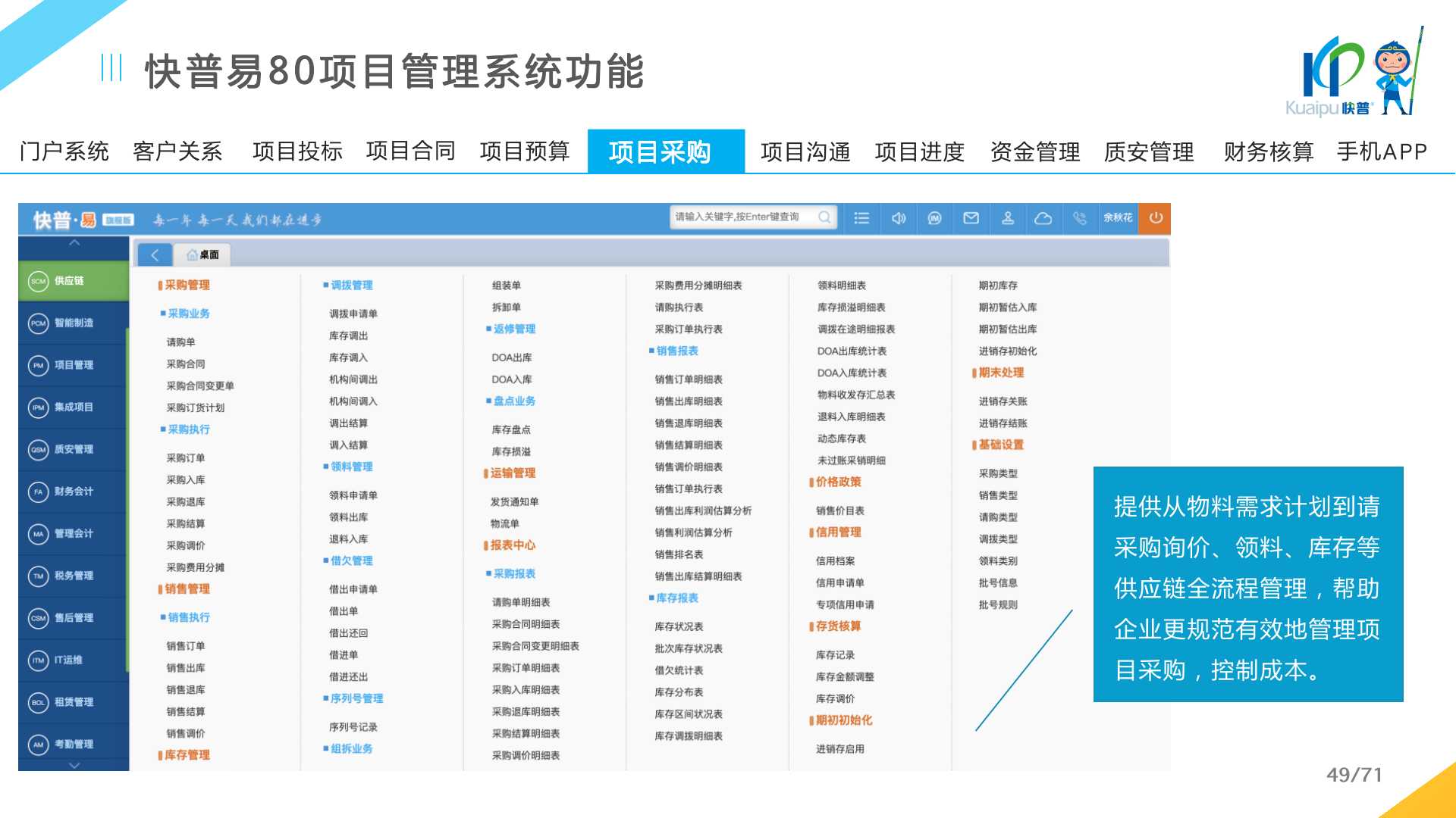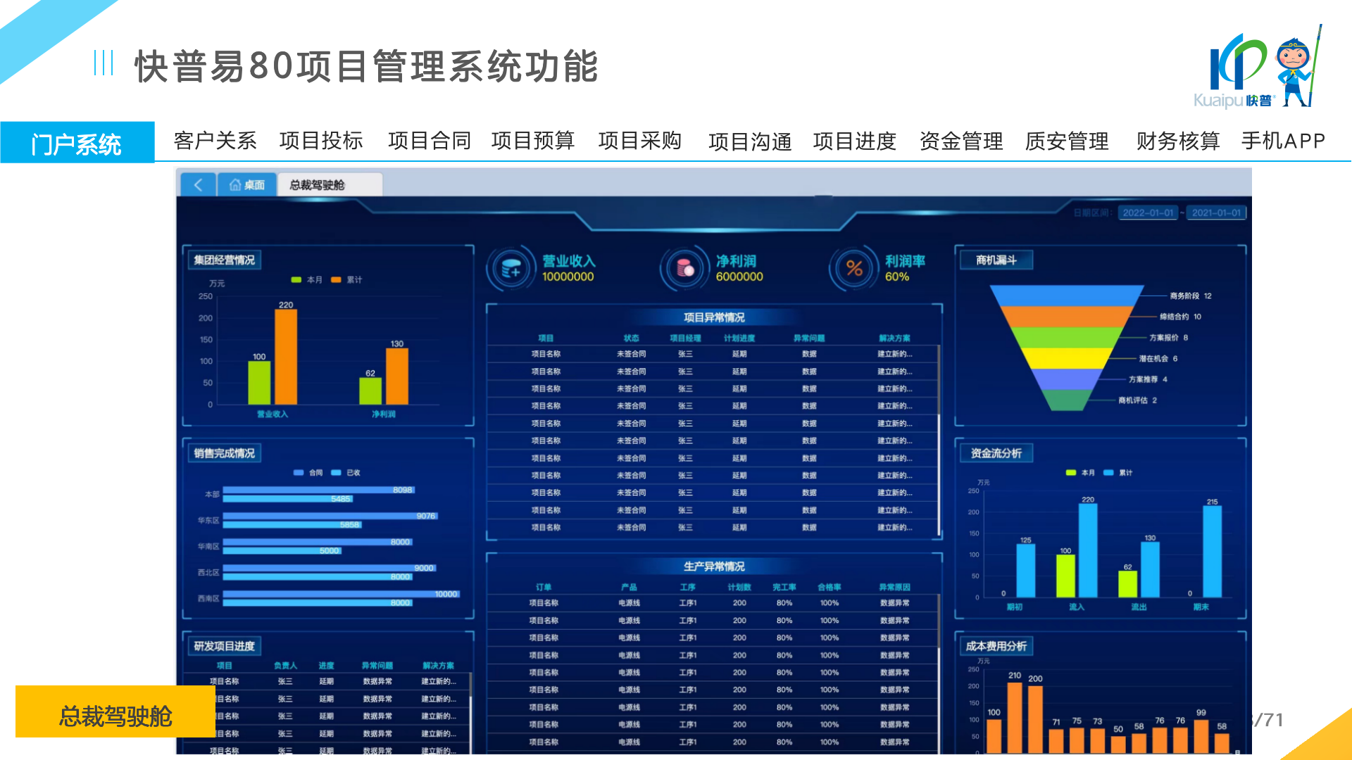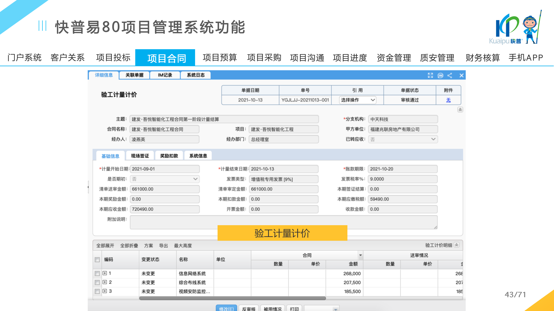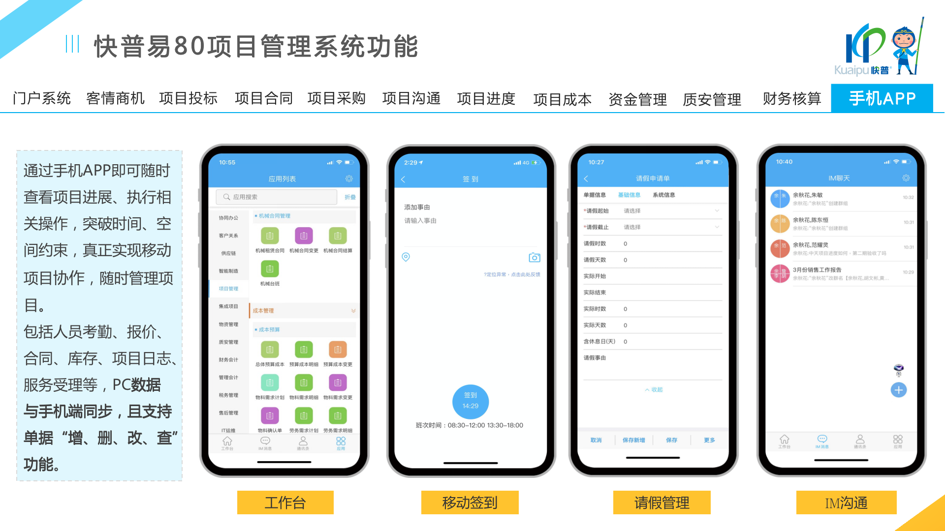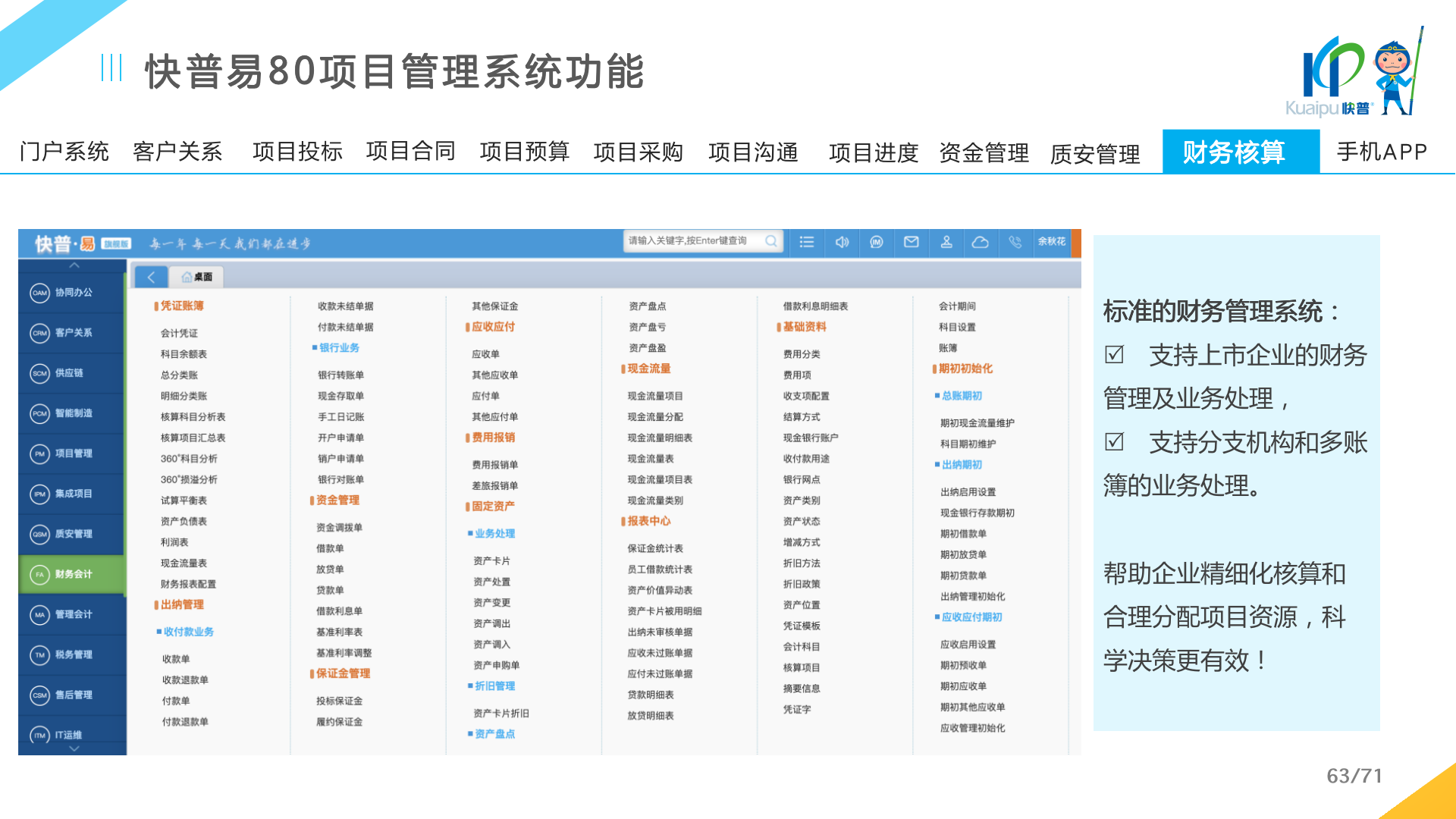 快普易80以項(xiàng)目管理為核心,通過(guò)“四控、四管、一協(xié)調(diào)”方式,對(duì)項(xiàng)目進(jìn)度、成本、資金、質(zhì)量安全進(jìn)行全面控制,實(shí)現(xiàn)投標(biāo)管理、合同管理、物資管理、預(yù)算管理等項(xiàng)目全生命周期項(xiàng)目的數(shù)字化管理,實(shí)現(xiàn)資源合理配置、保障良好的項(xiàng)目效益。
