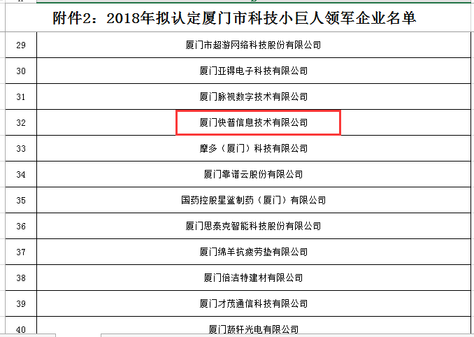 近日,快普獲“廈門市科技小巨人領(lǐng)軍企業(yè)”榮譽稱號,這是繼2017年獲得廈門市科技小巨人企業(yè)后,再次榮膺領(lǐng)軍企業(yè)行列。