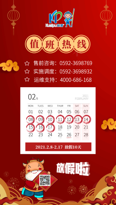 值此春節(jié)來臨之際,根據(jù)《國務(wù)院辦公廳公布2021年春節(jié)放假安排》,結(jié)合公司實(shí)際情況與工作安排,現(xiàn)將我司春節(jié)放假安排如下: