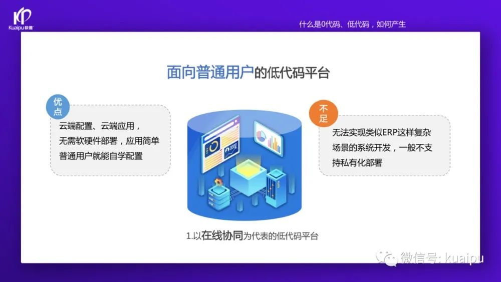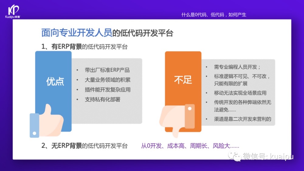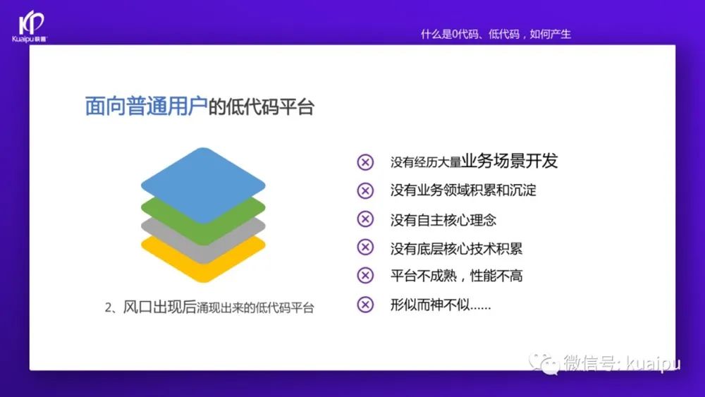 “這兩年快普已經(jīng)成功轉型為數(shù)字化平臺服務商,為客戶提供開發(fā)平臺和解決方案(產(chǎn)品)等服務。我們先從開發(fā)平臺說起,目前市場上的零代碼、低代碼平臺大致可以分為這幾類:
