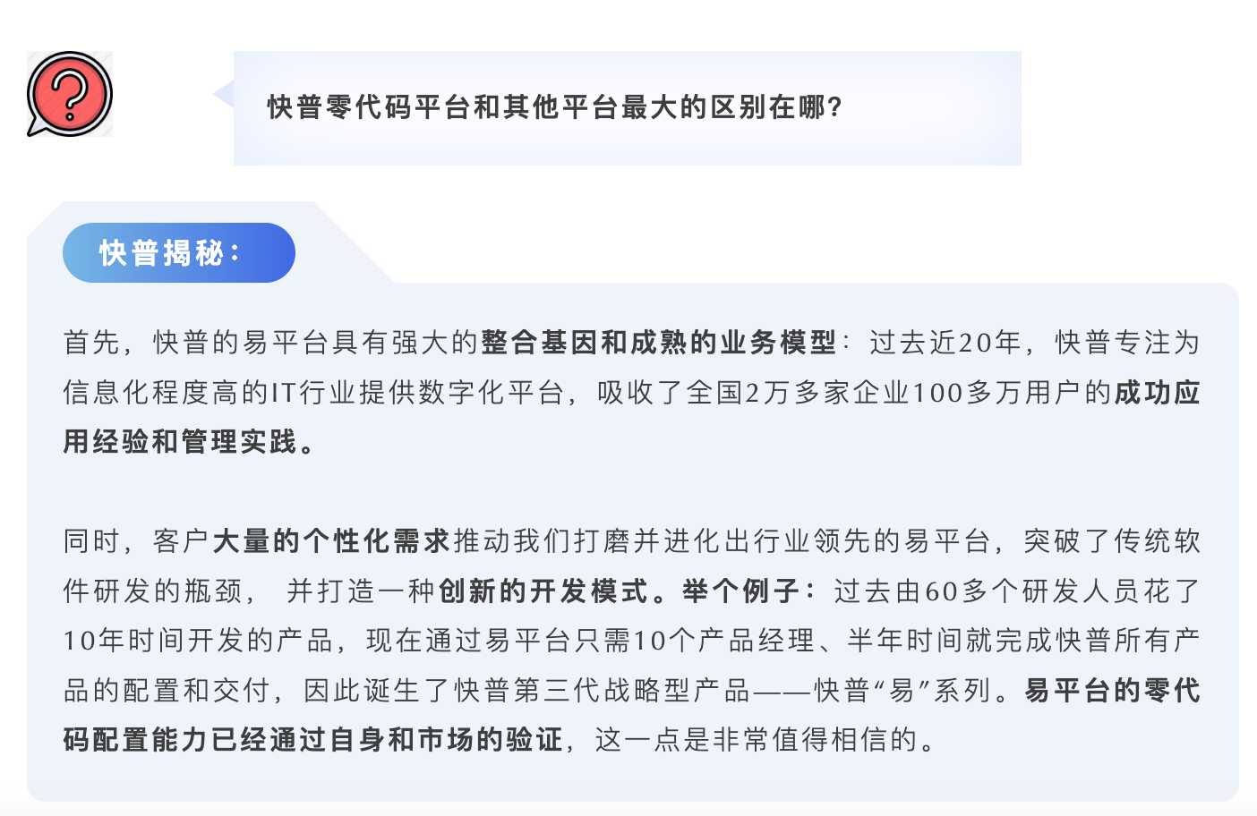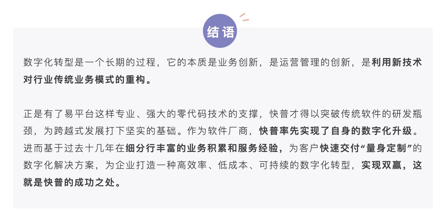 是的,我們可以很自信地說“快普零代碼平臺讓數(shù)字化轉型變得簡單、可行”。這個是面對數(shù)字化轉型的所有角色而言的,包括我們自身軟件研發(fā)、實施交付,以及合作伙伴、用戶等,易平臺在效率、成本、技術門檻和可擴展性等方面來說都有著顛覆性的突破,是非常有意義和必要的基礎設施??偨Y說有下面幾點: