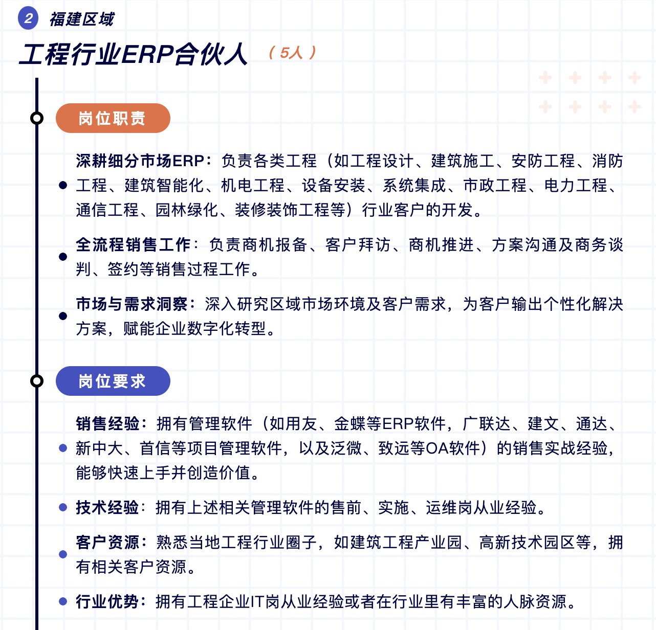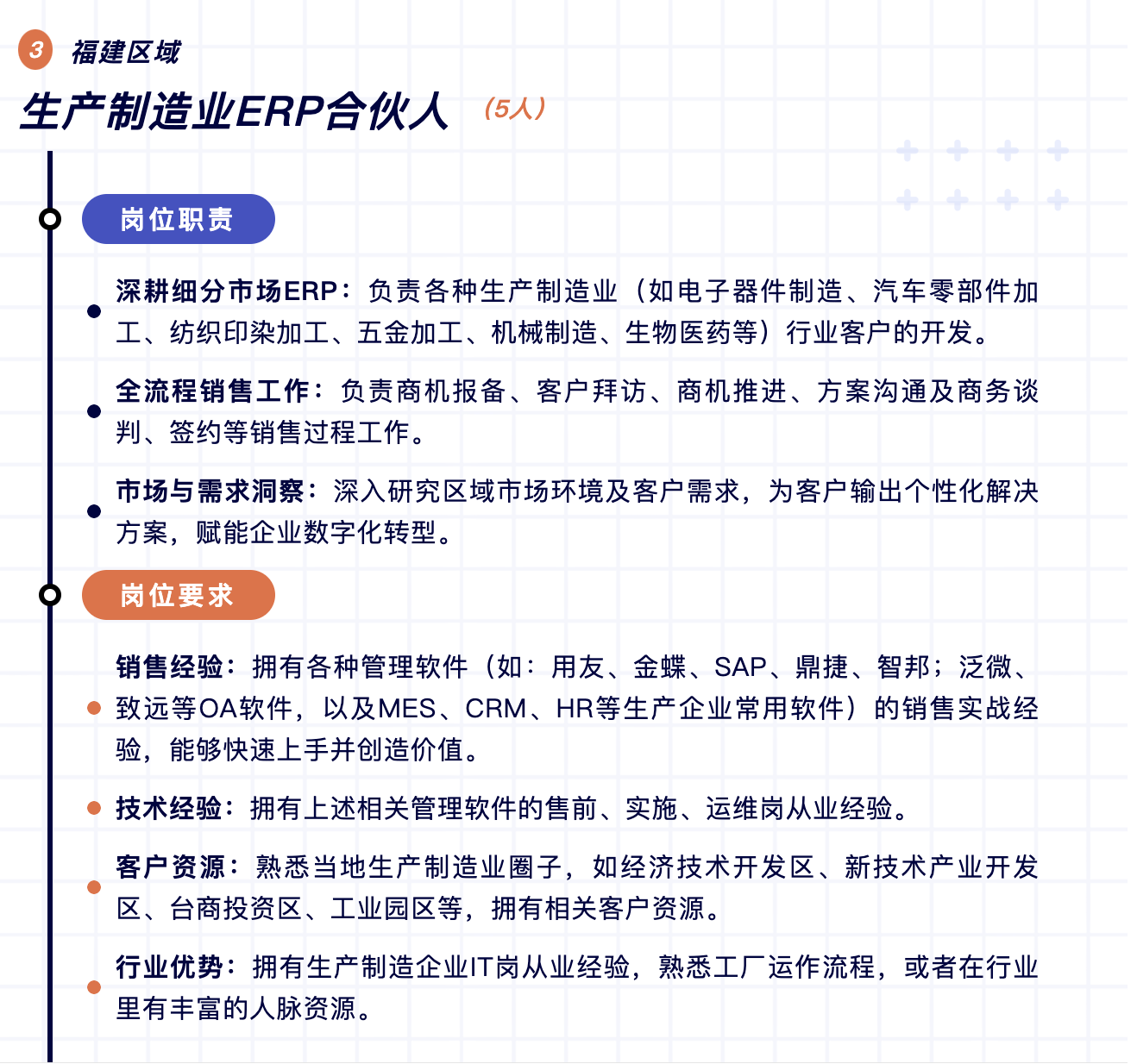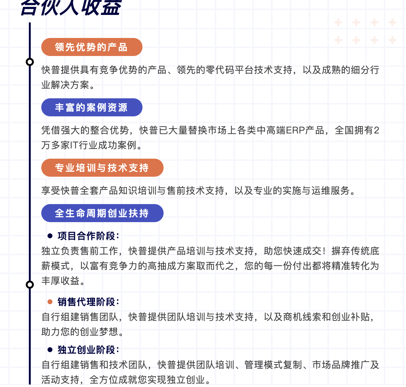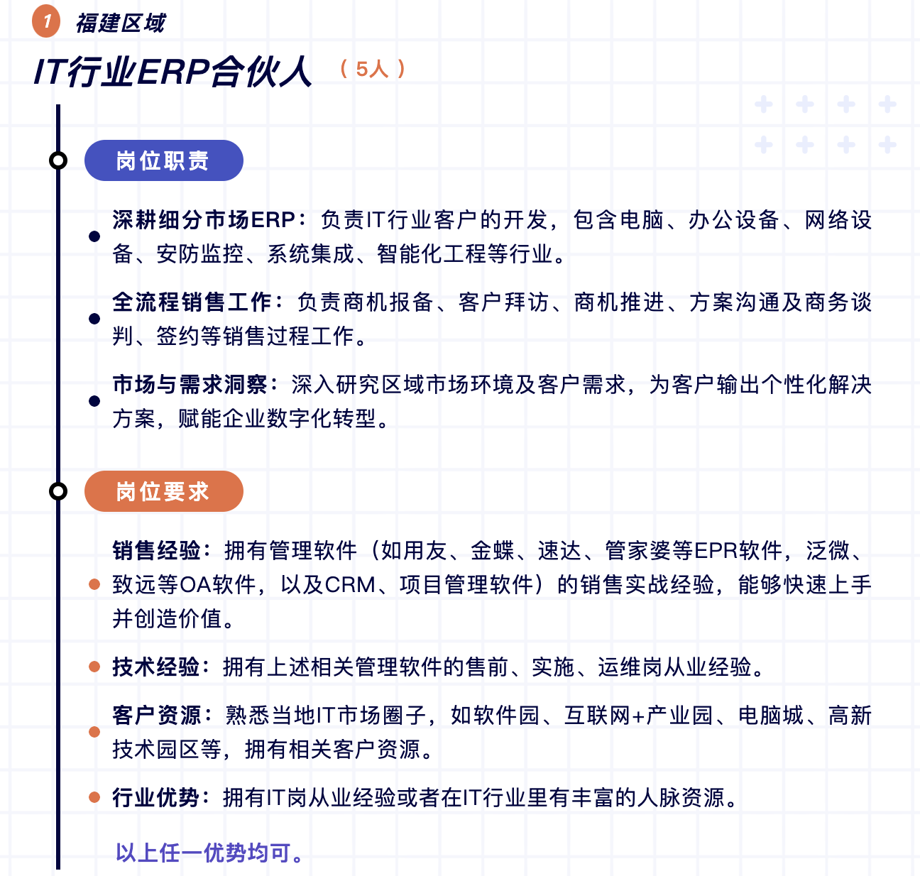 當(dāng)前數(shù)字化轉(zhuǎn)型市場巨大,為進(jìn)一步推動(dòng)中小企業(yè)數(shù)字化轉(zhuǎn)型,現(xiàn)將福建區(qū)域作為2025年首批試點(diǎn)城市,面向福州、廈門、泉州、漳州、龍巖、三明、南平、寧德等地招募城市合伙人。作為快普全國第一批試點(diǎn)城市合伙人,將享受到最優(yōu)厚的政策扶持與廣闊的發(fā)展舞臺。
