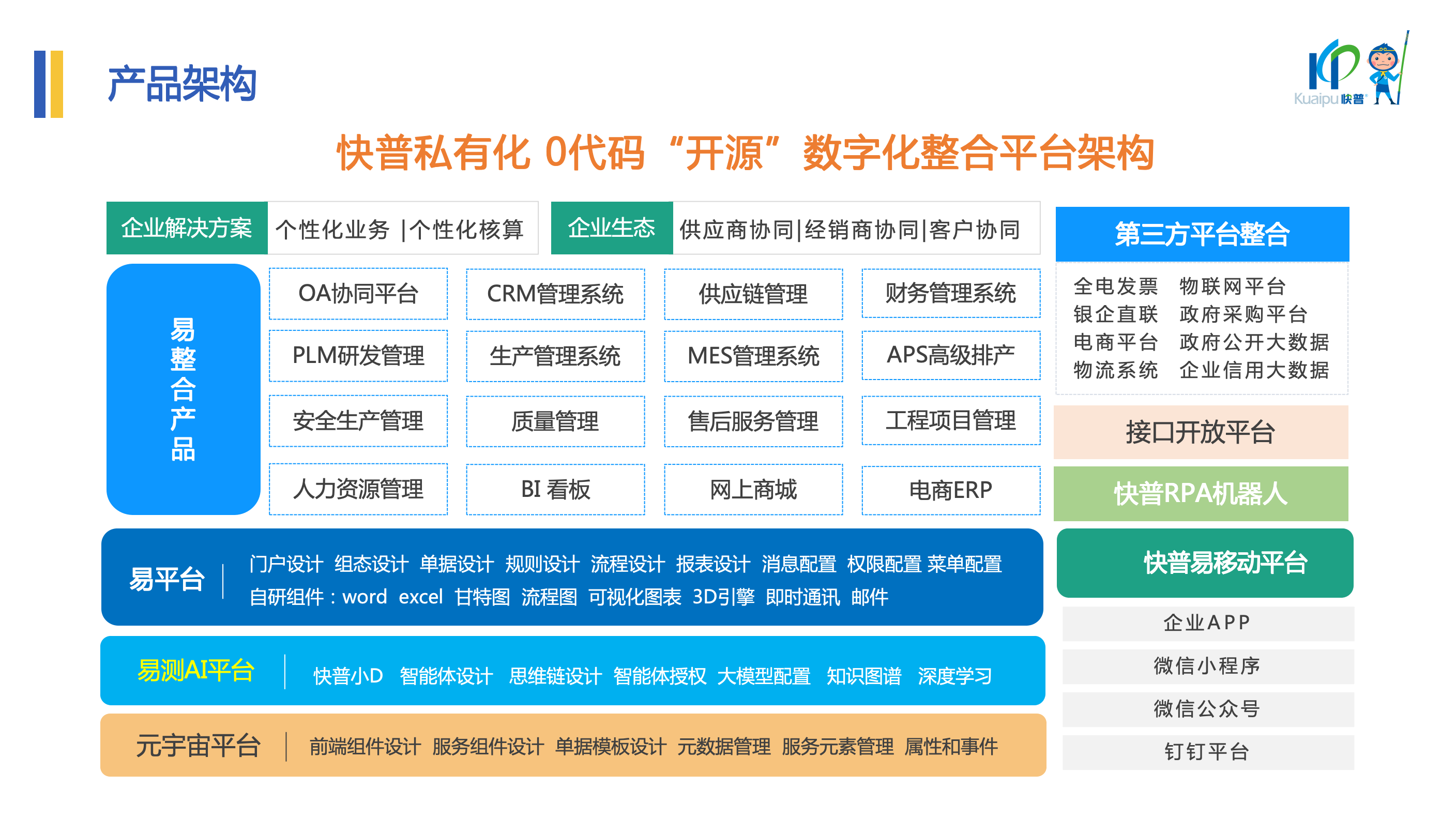 針對(duì)企業(yè)普遍面臨的“信息孤島”難題——系統(tǒng)林立、數(shù)據(jù)不通、業(yè)務(wù)流程斷點(diǎn)卡點(diǎn)眾多,導(dǎo)致內(nèi)部協(xié)同低效、管理成本高昂等問(wèn)題,溫董指出:“系統(tǒng)整合是提質(zhì)增效最有效的手段,碎片化的系統(tǒng)建設(shè)模式已成為制約企業(yè)全局效率的罪魁禍?zhǔn)??!?br> 快普以“整合管理”為核心的數(shù)字化轉(zhuǎn)型理念,通過(guò)“一個(gè)平臺(tái)”覆蓋企業(yè)全鏈條管理,包括PLM研發(fā)管理、APS高級(jí)排產(chǎn)、MES車間執(zhí)行、供應(yīng)鏈協(xié)同、集團(tuán)化財(cái)務(wù)核算等。