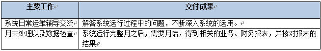 該階段主要是做系統(tǒng)開賬運作之后,持續(xù)支持運用中出現(xiàn)的所有問題,系統(tǒng)運行完整月之后,指導月結(jié),得到相關(guān)的報表數(shù)據(jù)。該階段結(jié)束以《持續(xù)支持里程碑確認單》作為交付。
