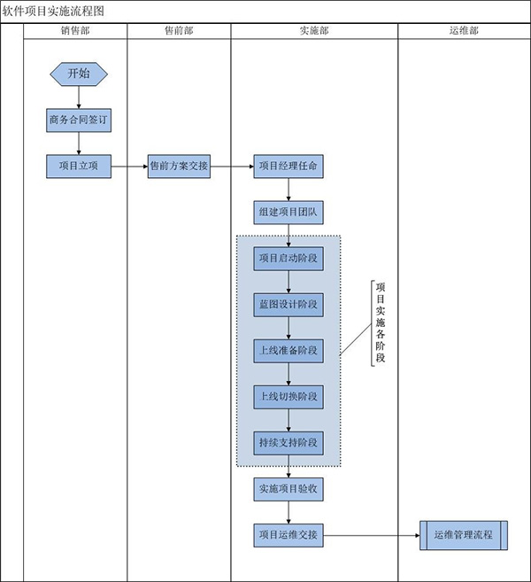 快普軟件項目實施分為五個階段:項目啟動階段、藍圖設(shè)計階段、上線準備階段、上線切換階段、持續(xù)支持階段。每個階段都有對應的階段交付成果。完成這五個階段的任務之后,進入實施項目驗收階段。實施驗收完成之后,轉(zhuǎn)入運維部門,實施過程結(jié)束。