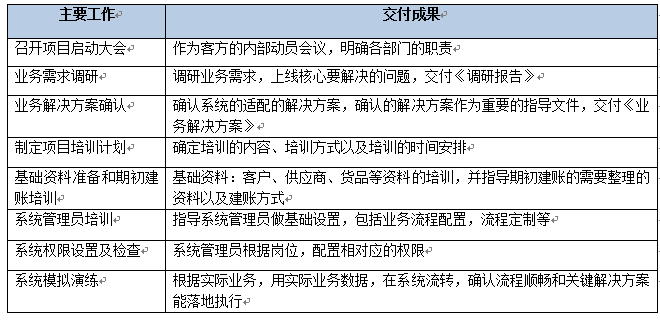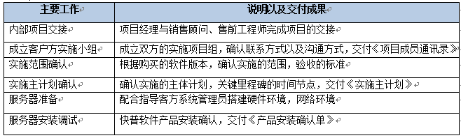 該階段主要是做實施基礎(chǔ)的搭建,包括完成內(nèi)部交接、確認雙方的項目組成員名單、確認實施范圍、確認實施計劃、服務器準備以及軟件部署。該階段結(jié)束以《項目啟動階段里程碑確認單》作為交付。